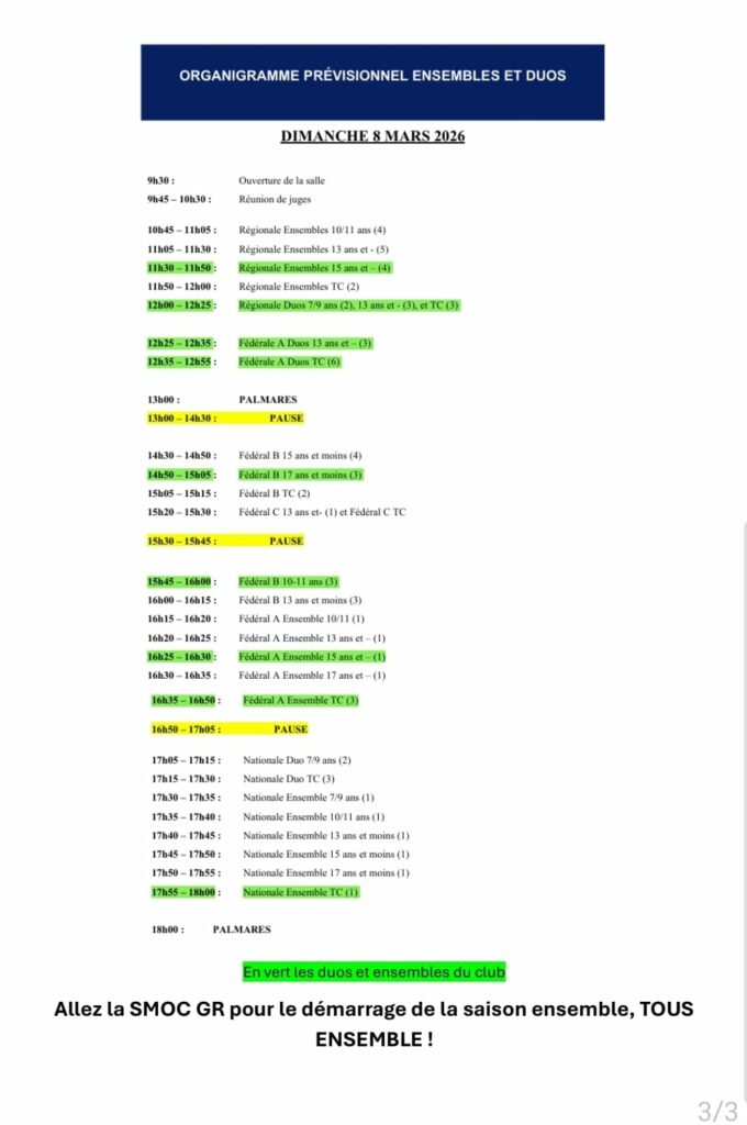 Agenda📅 Mars 2026 Samedi 7 et Dimanche 8 mars : Coupe Formation Etape 1 et Compétition Départementale Ensembles et Duos Samedi 21 et Dimanche 22 mars : Compétition Inter-Départementale Ensembles et Duos